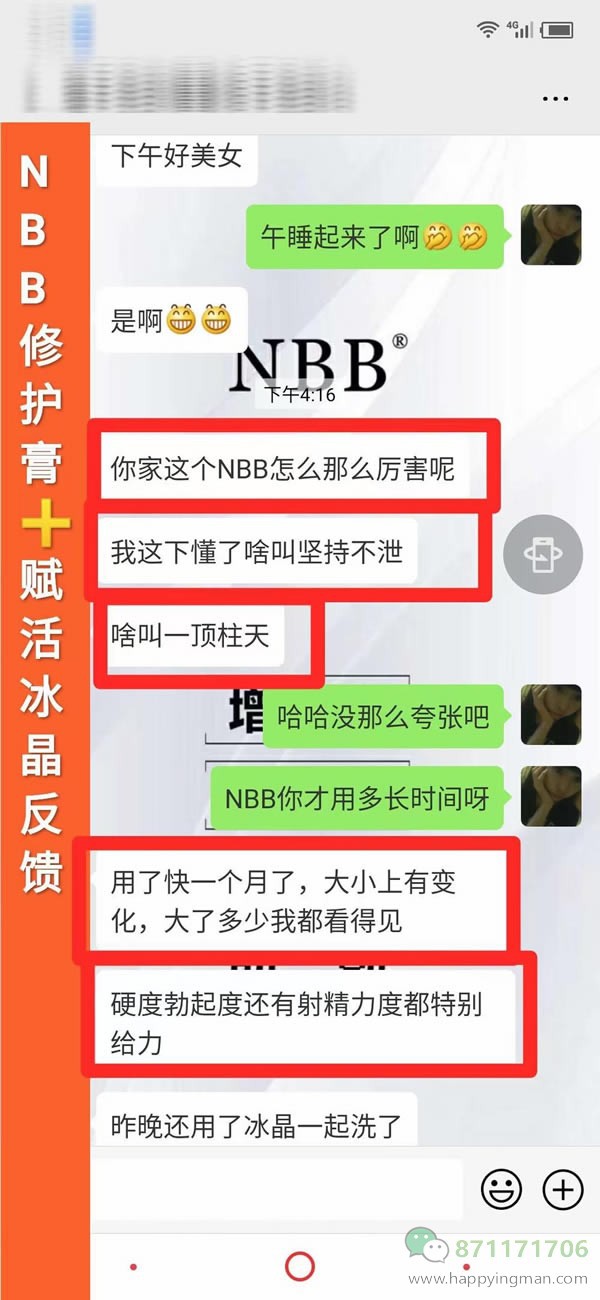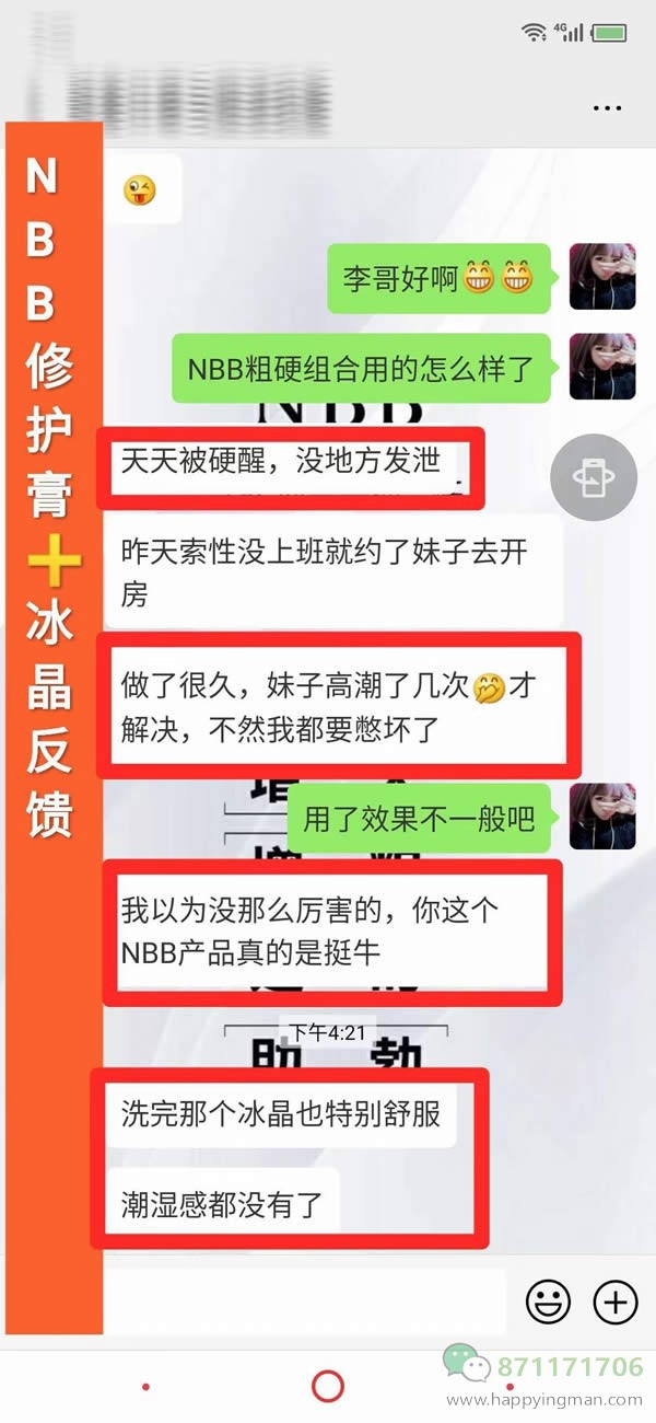 客户说:“你家这个NBB怎么这么厉害呢” “我这下懂了啥叫坚持不泄,啥叫一顶柱天(一柱擎天)” 用了快一个月了,大小上有变化,大了多少我都看得见,硬度勃起度还有射精力度都特别给力 昨晚和nbb赋活冰晶一起洗了 感觉用完了账活冰晶之后nbb修护膏吸收得更好一点 异味瘙痒都没有了 昨晚完事之后还是硬邦邦…