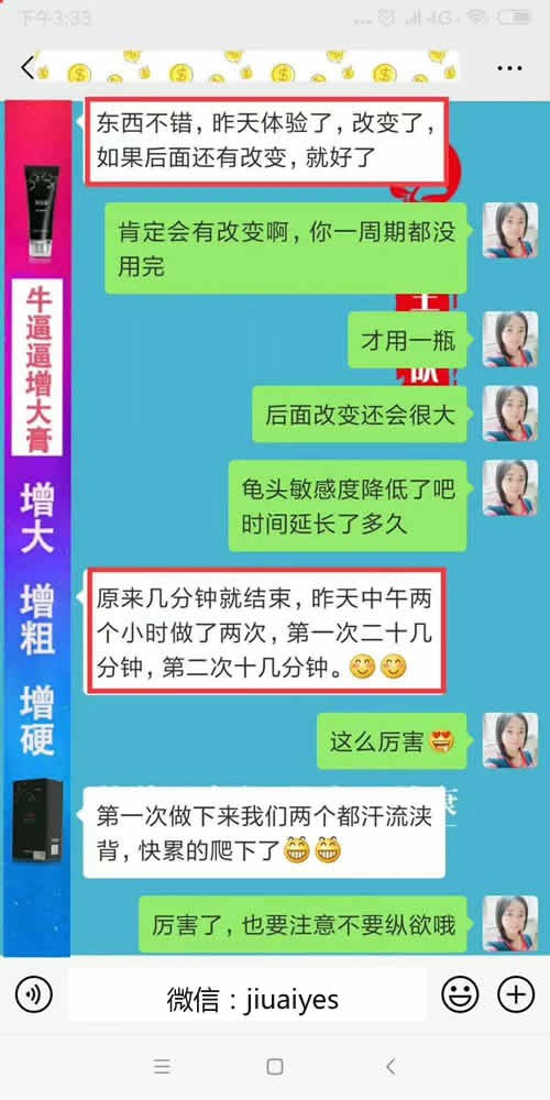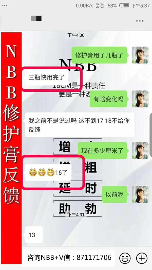 NBB到底有没有效果?我们看一下顾客反馈,这位顾客主动发来使用前后对比照片,男人,JJ大了,自信满满,提起自已的老二,无比兴奋,而那些老二不给力的朋友,怕是提起这事就摇头,暗自流泪了,看到别人的JJ,投去羡慕目光,却不知道人家除了天生的尺寸之外,还有平时的保养,因为人的身体机能不断退步,只有不断地保…