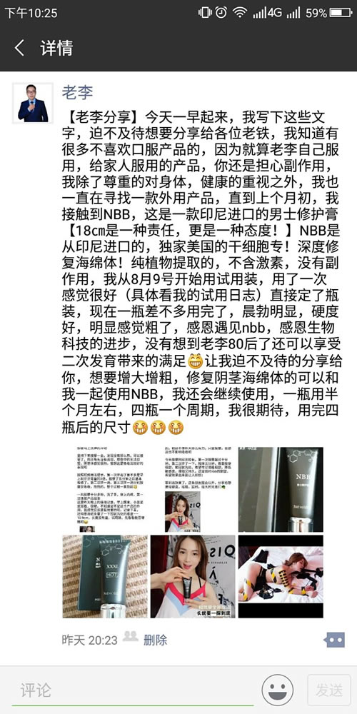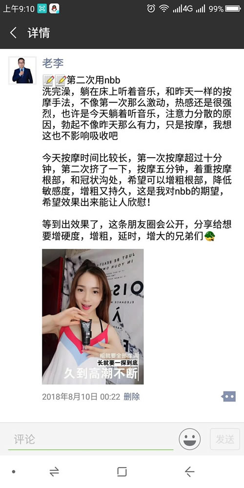用NBB一支多了,效果很明显,勃起硬度杠杠滴,根部明显粗了一点,每天晚上睡觉前都会按摩十分钟,已经成为习惯,不是麻烦而是享受,因为按摩的过程很舒服的感觉哦😊