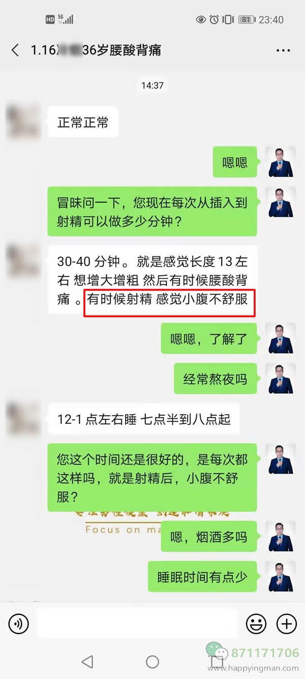 这位朋友36岁,现在硬度和时间方面都挺正常的,只是有时候会腰酸背疼,射精后小腹疼痛,到底是怎么回事呢?我以前也遇到这样的情况,没有经验的朋友可能会比较紧张,怀疑自已身体出了问题。