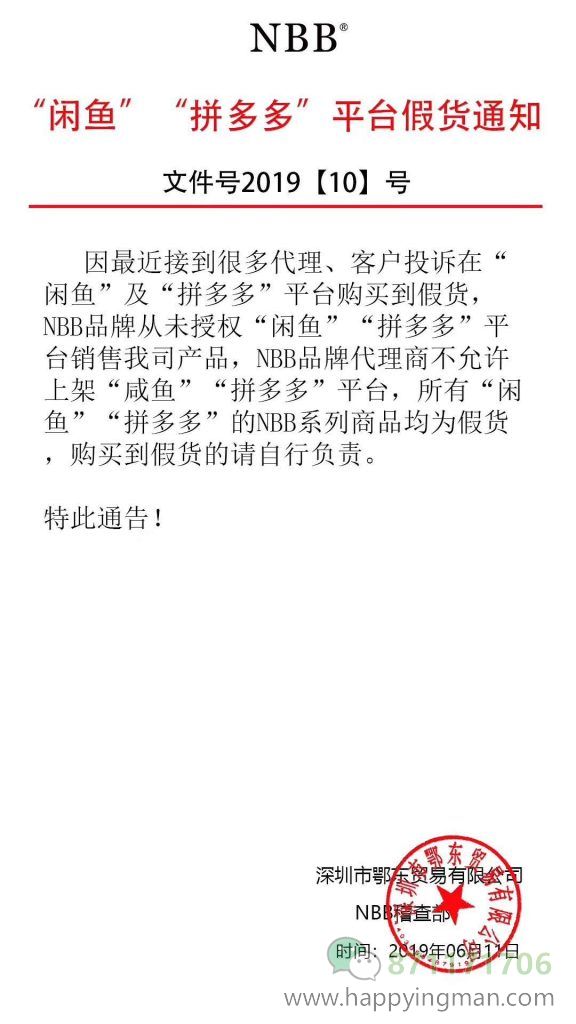 NBB公司目前只授权天猫和京东两个平台可以销售,拼多多上的所有NBB品牌均为假货,公司早在去年6月就发布了红头文件公告,请大家千万不要贪图便宜。
